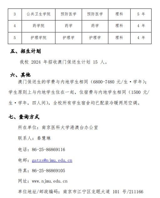 南京医科大学2024年澳门保送生招生简章